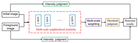 Given the different sizes and speeds of moving objects, the corresponding shadows are different in size and shape. It is difficult to choose the optimal neighborhood size. If the neighborhood size is too small, there will be some discrete false alarms. On the contrary, some small shadows cannot be well detected. As a consequence, the multi-scale neighborhood similarity is adopted to ensure that there are as few discrete false alarm points as possible, and that the effect of object detection is as good as possible. The multi-scale neighborhood similarity is defined as follows: