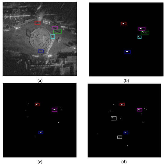 The classical methods mainly utilize the fact that the intensity value of the moving target’s shadow is lower than other objects’ to realize detection. Firstly, the average intensity of pixels at the same position in every 10 frames is taken as the pixel intensity in the background image. Then, the CFAR detector is adopted to detect moving targets. The size of the CFAR window is , and the window is for the target test. The probability of the false alarm rate (pfa) is set to 0.005. In order to suppress false alarms in the detection result, the morphological operation and connected component detection are adopted. For simplicity, this method is called the MEAN-CFAR method. The detection results of different methods on the 18th frame are presented in Figure 8b–d The ground truth is presented in Figure 8a. Five moving targets are labeled by five color rectangle boxes, and the white rectangle boxes represent the false alarms in all detection results.