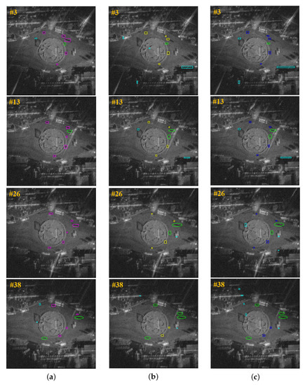 For the sake of intuitively displaying the detection results of different methods, we randomly select four frames from the processed image sequence, and annotate the minimum circumscribed rectangles of the binarization results on the original image, as shown in Figure 9. The correctly detected shadow targets of the 3rd, 13th, 26th, and 38th frames using the LRSD-BIIANS method are labeled by pink rectangle boxes. The yellow and blue colored boxes are the correctly detected moving targets of MEAN-CFAR method and LRSD-CFAR method. The green circles represent the missing targets and the cyan boxes are the false targets.
