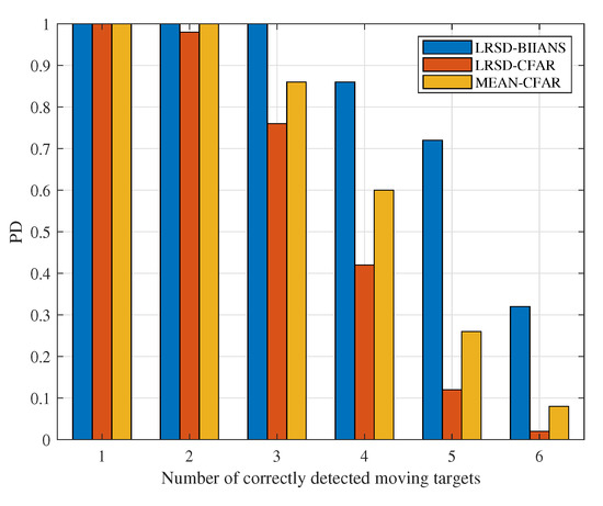 The curve and curve are shown in Figure 10 and Figure 11. The ground truth contains six moving targets. It is clear that all detection results of all methods contain two moving targets, as shown in Figure 10. Besides, all detection results of the LRSD-BIIANS method contain three moving targets. However, the detection probability of all frames is not guaranteed by the LRSD-CFAR and MEAN-CFAR methods. More importantly, the number of frames containing five moving targets obtained by the MEAN-CFAR and LRSD-CFAR methods does not exceed of the total frames. In contrast, the detection results of the LRSD-BIIANS method contain five targets. This indicates that the LRSD-BIIANS method performs better in detection probability. Another interesting is the results of red and yellow in Figure 10, which shows that the MEAN-CFAR method is slightly better than the LRSD-CFAR method in detection probability.