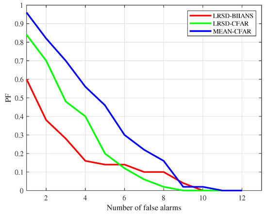 Apart from the high detection rate, the proposed method also shows good performance in suppressing false alarms, as shown in Figure 11. When the number of false alarms is lower than six, the value of the LRSD-BIIANS method is significantly lower than that of the LRSD-CFAR and MEAN-CFAR methods. More specifically, when the number of false alarms is four, the value of the LRSD-BIIANS method is 16%, while the value of the LRSD-CFAR method and MEAN-CFAR method is twice and three times that of the LRSD-BIIANS method, respectively. This indicates that the detection results of the MEAN-CFAR method and LRSD-CFAR method contain more frames with four false targets, which will give rise to a severe troublesome in moving target localization. In addition, the PF value of the LRSD-CFAR method is smaller than that of the MEAN-CFAR method, indicating that the LRSD-CFAR method is superior to the MEAN-CFAR method in suppressing false alarms.