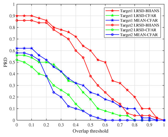 It should be emphasized that the integrity of the detection results affects the accuracy of moving target localization and tracking. According to the formation mechanism of the shadows of moving targets, some moving targets show low contrast with the surrounding background, and their boundaries are inevitably blurred, which is a great challenge for complete shadow detection. Therefore, it is necessary to evaluate the integrity of target detection results. We select two moving targets and give their curves of different methods, as shown in Figure 12. On the one hand, the value of the LRSD-BIIANS method is higher than that of the other two methods. It means that if the overlapping area between the detection result and the ground truth is the same, the LRSD-BIIANS method obtains more images with complete target shadow detection results than other methods. This can improve the accuracy of moving target tracking. Especially, as for target 1, when the overlap ratio is , the values of the MEAN-CFAR method and the LRSD-CFAR method are only and 24%, respectively.