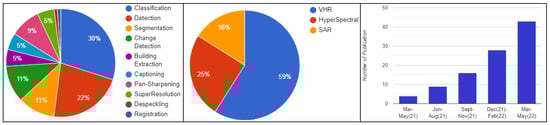 Recent transformer-based techniques in the remote sensing imaging. On the left and middle: pie-charts are representing statistics of the articles covered in this survey in terms of different remote sensing imaging problems and data type representations. On the right: we show a plot illustrating the consistent increase in the number of papers recently.
