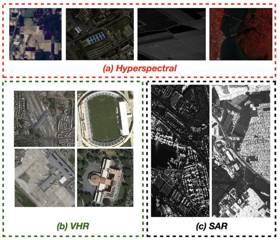 Remote sensing imagery is generally acquired from a range of sources, as well as data collection techniques. Remote sensing image data can be typically characterized by their spatial, spectral, radiometric, and temporal resolutions. Spatial resolution refers to each pixel size within an image along with the area of the surface of the Earth represented by that corresponding pixel. Spatial resolution characterizes the small and fine-detailed features in an imaging scene that can be separated. Spectral resolution refers to the capability of the sensor to collect information about the scene by discerning finer wavelengths with narrower bands (e.g., 10 nm). On the other hand, radiometric resolution characterizes the extent of the information in each pixel, where a larger dynamic range for a sensor implies more details are to be discerned in the image. The temporal resolution refers to the time it takes between consecutive images of the same location on ground acquired by the sensor. Here, we briefly discuss commonly utilized remote sensing imaging types with examples shown in Figure 2.