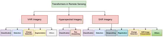 The taxonomy of transformers in VHR, hyperspectral and SAR imagery with a variety of tasks, such as classification, detection, segmentation, pan sharpening and change detection.