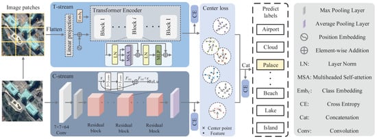 Remote sensing scene classification is a challenging problem, where the task is to automatically associate a semantic category label to a given high-resolution image comprising ground objects and different land cover types. Among the existing vision transformer-based VHR scene classification approaches, Bazi et al. [4] explore the impact of the standard vision transformer architecture of [1] (ViT) and investigate different data augmentation strategies for generating addition data. In addition, their work also evaluates the impact of compressing the network by pruning the layers while maintaining the classification accuracy. The work of [31] introduces a joint CNN-transformer framework, where there is one CNN stream and another ViT stream, as shown in Figure 5. The features from the two streams are concatenated and the entire framework is trained using a joint loss function, comprising cross-entropy and center losses, to optimize the two-stream architecture. Zhang et al. [32] introduce a framework, called Remote Sensing Transformer (TRS), that strives to combine the merits of CNNs and transformers by replacing the spatial convolutions with multi-head self-attention. The resulting multi-head self attention bottleneck has fewer parameters and is shown to be effective compared to other bottlenecks. The work of [5] introduces a two-stream Swin transformer network (TSTNet) that comprises two streams: original and edge. The original stream extracts standard image features, whereas the edge stream contains a differentiable edge Sobel operator module and provides edge information. Further, a weighted feature fusion module is introduced to effectively fuse the features from the two streams for boosting the classification performance. The work of [6] introduces a transformer-based framework with a patch generation module designed to generate homogeneous and heterogeneous patches. The patch generation module generates the heterogeneous patches directly, whereas the homogeneous patches are obtained using a superpixel segmentation method.