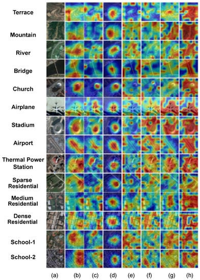 Comparison in terms of response maps obtained using different models on example VHR images. The original images are shown in (a), whereas the evaluated models are: (b) IMP-ResNet-50, (c) SeCo-ResNet-50, (d) RSP-ResNet-50, (e) IMP-Swin-T, (f) RSP-Swin-T, (g) IMP-ViTAEv2-S and (h) RSP-ViTAEv2-S. Here, IMP denotes ImageNet pre-training and RSP refers to remote sensing pre-training. In the response map, the warmer color indicates a higher response. Figure is from [7].