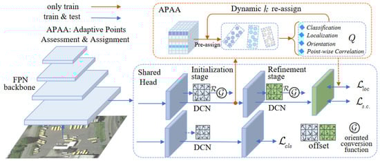 Overview of the anchor-free Oriented RepPoints detection architecture [46] that strives to learn selecting points samples for classification, regression and orientation. RepPoints utilizes the same structure of the shared head as in [46], except a quality assessment and sample assignment strategy (APAA) are employed for selecting high-quality sample points for training. Figure is adapted with permission from [46]. Best viewed zoomed in.