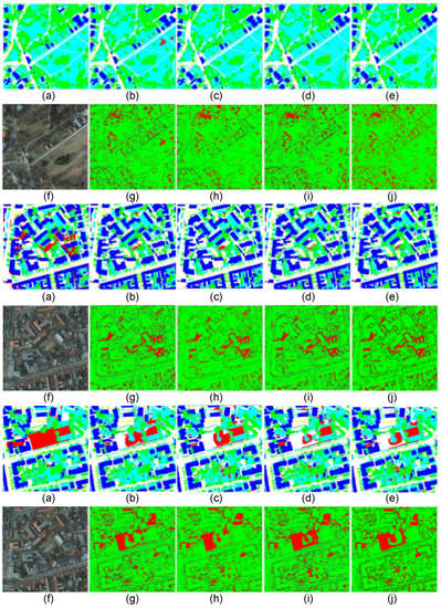 A qualitative comparison between the hybrid Trans-CNN with other existing segmentation approaches. The examples are from the Potsdam dataset. Every two rows present the results as a group. Here, from left to right and top to bottom are: (a) the corresponding ground-truth, (b) results obtained from AFNet + TTA, (c) results of ResUNet, (d) results of CASIA2, (e) results achieved using Trans-CNN and (f) the RGB image. The inccorect classification results from AFNet + TTA, ResUNet, CASIA2 and Trans-CNN are presented in (g–j), respectively. Figure is from [68].