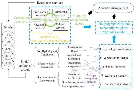 The objectives of this study were to (1) reveal the spatiotemporal dynamics of ESs in the YRD from 1980 to 2020; (2) determine the spatial heterogeneity of trade-offs/synergies and CCD between ESs; (3) identify the dominant social–ecological drivers of ESs, as well as their spatial heterogeneity; (4) provide insights into the spatial planning and management strategies of Dongying City. The research framework diagram of this study is shown in Figure 1.