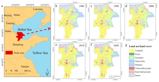 The location of Dongying city and its land use/land cover (LULC). (a) The location of Dongying city. (b–f) The LULC of Dongying city in 1980, 1990, 2000, 2010, and 2020, which was adopted from remote sensing monitoring data of LULC in China (http://www.dsac.cn/DataProduct/Detail/200804) (accessed on 1 February 2023). (g) The legends of LULC.