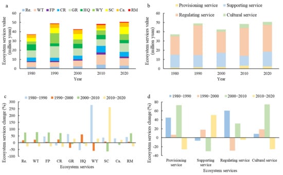 The temporal variability and change rate of ecosystem services (ESs) in the Yellow River Delta (YRD) from 1980 to 2020. (a,b) The temporal variability of ESs in the YRD from 1980 to 2020. (c,d) The change rate of ESs in the YRD from 1980 to 2020. (FP: food production, RM: raw material, SC: soil conservation, Ca.: carbon storage, HQ: habitat quality, GR: gas regulation, CR: climate regulation, WY: water yield, WT: waste treatment, Re.: relaxation.)