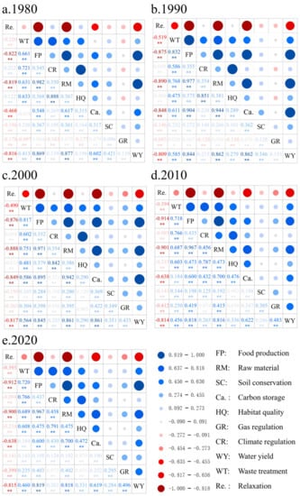 A total of 45 correlations were identified between 10 ESs per year, whose correlations were statistically significant (p < 0.05) (Figure 5). There were similarities in the correlations in all 5 years. First of all, the relationships between Re. and other ESs were basically negative, with higher trade-offs between FP, RM, CS, and WY. Secondly, other ES were basically positive correlations, among which WT, FP, CR, RM, HQ, and CS had high synergies.