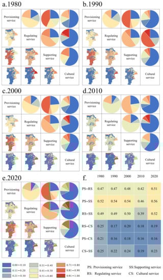 The temporal variability and change rate of ESs in the YRD from 1980 to 2020 is shown in Figure 3. ESs in the YRD in 1980, 1990, 2000, 2010, and 2020 were CNY 37.01, 48.89, 42.47, 48.30, and 50.49 billion, respectively, with an overall fluctuating upward trend, where RS generated the largest share, followed by SS, which was consistent with previous studies [13,49]. In RS, GR accounted for the largest share, followed by WY and WT. PS and CS showed a fluctuating upward trend, while RS and SS remained relatively unchanged, which indicated that the ESs provided by artificial ecosystems increased. The change rates of SS and CS from 2000 to 2010 were relatively high, while WY had the highest rate between 1980 and 1990, followed by SC between 2010 and 2020.