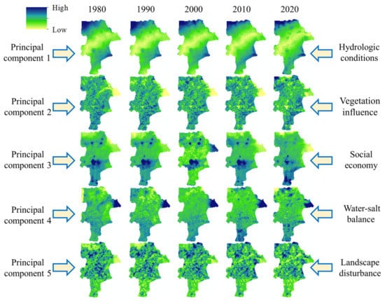 It can be seen from Table 7 that, in the first PC, the absolute value of the hydrographic net and runoff loads was relatively large, indicating that these variables had high correlation coefficients with the first PC, which can be named hydrologic conditions. In the second PC, the absolute value of temperature and sediment loads were relatively large. Since temperature is one of the important factors for vegetation growth, which is an important factor for sediment transport, the second PC can be called vegetation influence. In the third PC, the absolute value of population, GDP, traffic roads, and shoreline use intensity loads were large, so the third PC was called social economy. In the fourth PC, the absolute values of precipitation and salinization loads were large. Considering that the cause of salinization is strongly associated with precipitation, the fourth PC was consequently called water–salt balance. In the fifth PC, the absolute value of landscape disturbance load was large, so the fifth PC was called landscape disturbance. The spatial pattern of PCs of social–economic drivers in the YRD from 1980 to 2020 is shown in Figure 7.