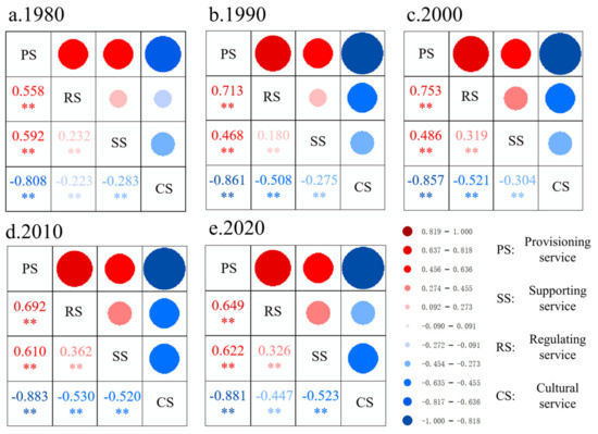 Correlations among 10 types of ecosystem services (** represents p < 0.01) in the Yellow River Delta, 1980–2020. The lower left part of each panel shows the Spearman’s correlation coefficients. The blue and red symbols represent positive and negative correlations, respectively.
