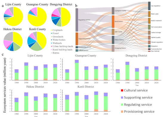 We identified 10 ESs based on the following criteria: (1) consistency with the classification of ESs by Millennium Ecological Assessment (MEA) [26] and previous studies [27]; (2) representativeness of ESs for social–economic conditions in the study area; (3) availability and feasibility of data. According to the characteristics of the YRD and the classification of ESs in the MEA [26], the YRD wetland ESs were classified as supporting service (SS), regulating service (RS), provisioning service (PS), and cultural service (CS) (Table 2). The final evaluation system included 10 indicators, namely food production (FP), raw material (RM), soil conservation (SC), carbon storage (Ca.), habitat quality (HQ), gas regulation (GR), climate regulation (CR), water yield (WY), waste treatment (WT), and relaxation (Re.). Firstly, the ESs in 1980, 1990, 2000, 2010, and 2020 were quantified in monetary form. For the subsequent analysis, we superimposed all ESs classifications into four categories, namely SS, RS, SS, and CS.