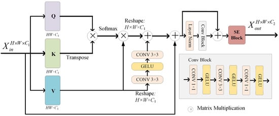 The structure of the SAT has two sub-layers and a squeeze-and-excitation (SE) block. Each sub-layer employs a residual structure. Let be the input feature maps of SAT, where H, W, and are the height, width, and number of feature map channels. First, is reshaped to the size of , and then three parallel linear layers are used to generate , , and , respectively. The attention matrix Z is computed by: