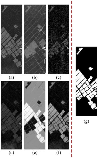 The third dataset is River, as shown in Figure 6e,f. The two images were acquired on 3 May 2013, and 31 December 2013. The main scenes are rivers and residential areas in Jiangsu Province, China, with 463 × 241 pixels. In total, 167 bands were selected after noise removal. The main change is sediment in rivers and residential areas.