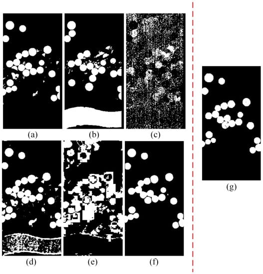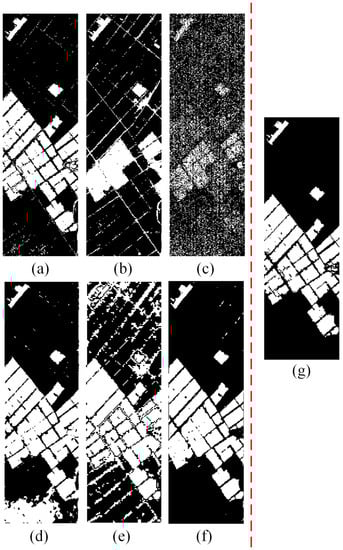 Binary results of different methods on the Farmland dataset. (a) CVA. (b) PCA-CVA. (c) IR-MAD. (d) DCVA. (e) CAMF. (f) UTBANet. (g) Ground truth.