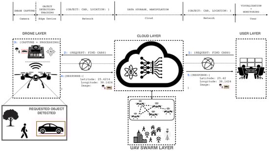 - The Swarm Layer: this layer consists of a cluster of UAVs equipped with camera sensors and AI-edge devices that coordinate together to perform a cooperative mission; for instance, distribute a search for lost people in a large area. In Figure 1, the UAVs swarm communicates with the cloud, which orchestrates their mission, rather than adopting ad hoc communication among the drones. The reasons are as follows: