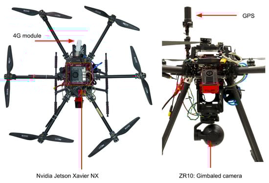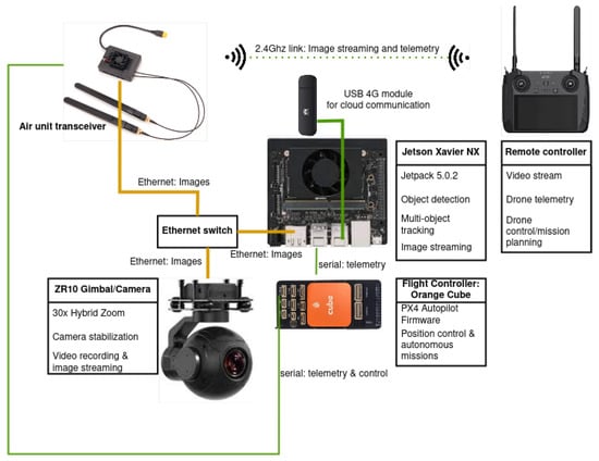 - NVIDIA Jetson Xavier NX: this is the main computation board (edge device) and has adequate GPU power to perform real-time object detection and advanced autonomous surveillance mission planning. It is connected to the camera–gimbal system, via an Ethernet switch, to receive the real-time image stream and send camera–gimbal commands to control the camera orientation and zoom level. The Xavier NX runs our custom software, which performs real-time object detection and localization, which is described in Section 2.2. It also has a connected 4G module to enable extended communication with the cloud server to send information about the detected objects and receive surveillance mission requests.