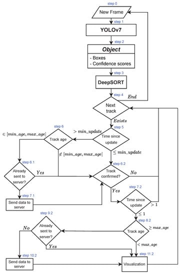 First, the system checks if the track has not been matched with a detected bounding box for more than a predefined number of consecutive frames (default value of 10). If so, the system assumes that the object is no longer in the camera’s field of view. Next, the system checks if the track’s age (number of frames in which the same object has been detected) is within a predefined interval (default value of [2, 40]). A low value indicates that the track is unreliable, whereas a high value means that the object information has already been sent to the server. The default values of the minimum number of consecutive frames and the track’s age interval were fixed empirically after a series of preliminary tests.