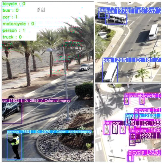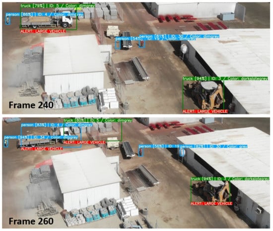 Table 5 summarizes the obtained results for these metrics when using the TRT implementations of the YOLOv4 object detector on video 1. The number of FNs is relatively low compared to the number of FPs due to the fact that most vehicles have a relatively large size (compared to video 4). The number of identity switches and changes is also reduced compared to video 4 because the distance between objects is markedly larger, which makes the tracker’s task easier. Figure 13 shows two close frames from the output of video 1 where several detection and tracking errors appear. We notice one false positive in frame 240 (‘person’), and two other false positives in frame 260 (‘person’ and ‘truck’), as well as a misclassification (truck classified as ‘person’). Between the two frames, there are three identity changes (4→34, 5→4, and 30→19). Identity switches often happen when two objects move close to each other, while identity changes may happen when the object’s speed is relatively high.