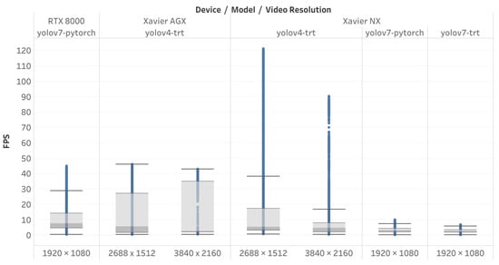 Figure 7 depicts the box plot of the inference speed in frames per second (FPS) for each device, detection model, and input video resolution. We observe that the TensorRT optimization of the YOLOv4 model provides the fastest inference speed, even on higher-resolution input videos, whereas, for YOLOv7, the TRT optimization provides no gain in speed. In contrast, the average inference speed deteriorates from 7.2 FPS (for the PyTorch implementation) to 2.8 FPS (for TRT). This is likely due to the fact that the new features introduced in YOLOv7 are not yet adequately optimized in the latest versions of TensorRT.