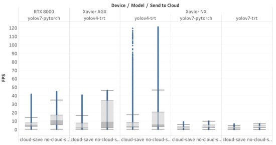 Figure 8 shows the box plot of the inference speed for each device and detection model in the case where the detected objects are sent to the cloud and in the case where the connection to the cloud is disabled. In all cases, the connection to the cloud significantly slows down the inference speed of the whole system. The average speeds drops from 12.3 FPS when no data are sent to the cloud to 5.0 FPS when sending data to the cloud. This highlights the importance of choosing a high-quality network and optimizing the edge–cloud communication.