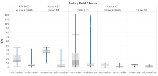 Figure 9 shows the box plot of the inference speed for each device and detection model in the case where the DeepSORT tracker is included or excluded. On all devices, and for all object detection models, the use of the tracker markedly decelerates the system. The average inference speed declines from 19.6 FPS (without tracker) to 5.0 FPS (with tracker). Nevertheless, the use of the tracker is necessary to correctly count the number of objects and send each object’s information to the server only once. We should, however, investigate faster multi-object trackers to enhance the overall system speed.