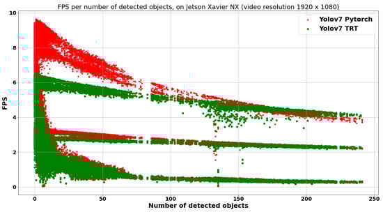 Inference speed (in FPS) per number of detected objects, on Jetson Xavier NX, with an input video resolution of 1920 × 1080, using the PyTorch and TRT version of the YOLOv7 object detection model.