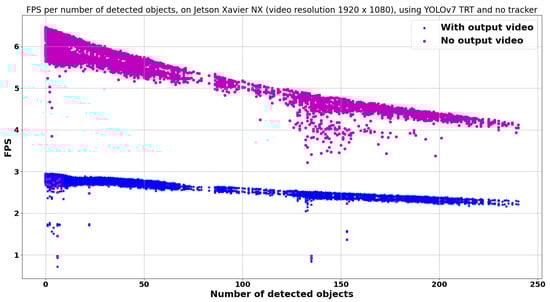 Inference speed (in FPS) per number of detected objects, on Jetson Xavier NX, with an input video resolution of 1920 × 1080, using the TRT version of the YOLOv7 object detection model, with no tracker, when including or excluding the saving of the video output.