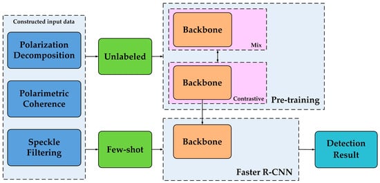 The classic Faster R-CNN [40] is applied as the ship detector, which uses region proposal network (RPN) to generate multiple regions that may contain targets, and then classifies and regresses each region. The pre-trained feature extraction backbone by the proposed improved CSSL method is plugged into Faster R-CNN instead of training from scratch. Only a few labeled ship samples are used to fine tune the Faster R-CNN network and few-shot PolSAR ship detection task is realized through this scheme.