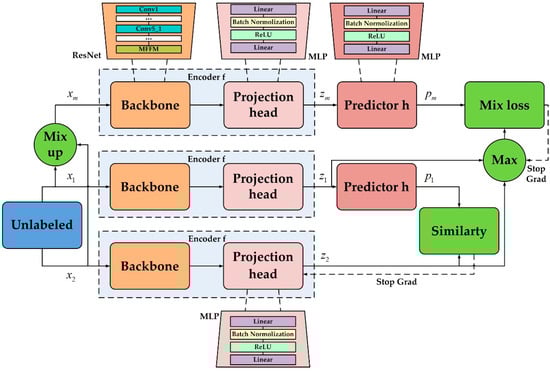 For the mix branch, a linear mixed view of the augmented views and is used as the input. Mix-up [52], as a method of data enhancement, is an effective regularization strategy, which improves the generalization ability of the model. is defined as: