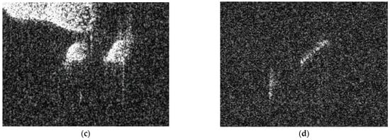 One labeled image is shown in Figure 5a, and Figure 5b–d gives the three local close-ups. Figure 5b shows a patch containing a labeled ship. Figure 5c,d illustrates two patches containing an island and an azimuth ambiguity respectively, which are similar with ships and thus are prone to form false alarms, indicating the challenge of the task.
