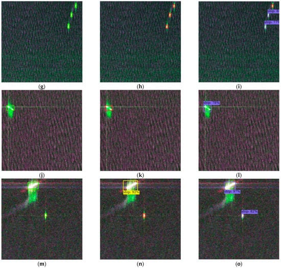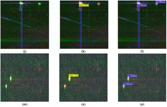Ship detection results visualization: (a,d,g,j,m) the green rectangle represents the ground truth; (c,f,i,l,o) the blue rectangle represents the detection results of our proposed method; (b) the yellow rectangle represents the detection results of all classic detectors, the red rectangle represents the missed detection, and the meaning of the rectangle is the same in following detectors; (e) all classic detectors except SSD; (h) SSD; (k) YOLO v3 and YOLO v3-tiny and FCOS; (n) Cascade R-CNN and SSD and YOLO v3 and YOLO v4.