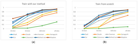 Through the comparison of the effect of whether to use CSSL pre-training and different numbers of input samples on the test results, it can be seen from Table 1 that after pre-training, the detection ability of the model has improved under each case of input samples, with an average improvement of 0.084 in the case of all-data, 0.096 in the case of 100-shot, 0.107 in the case of 50-shot, and 0.12 in the case of 30-shot. It shows that the smaller the number of input samples, the more obvious the improvement in the detection ability. Figure 8 also shows the situation intuitively.