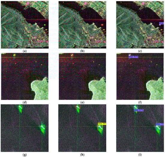 By analyzing the effect of eight polarimetric feature extraction methods in Table 1 on the detection results, we find that the input data constructed by Pauli decomposition, Refined Lee filtering and Adaptive filtering have achieved good detection results, exceeding 0.93 (AP). Since the Refined Lee filtering and Adaptive filtering are speckle filtering methods based on the Pauli decomposition, this shows that the Pauli decomposition method extracts more effective polarimetric and spatial features. Through speckle filtering, the spatial features are further enhanced at the cost of a certain loss of the polarimetric features. The detection results of the two speckle filtering methods are better than those of the original Pauli decomposition method, indicating that our method is more sensitive to the spatial features of the target. Freeman, Yamaguchi and Cui are polarization decomposition methods based on scattering models. Yamaguchi adds a helix component on the basis of Freeman. Cui exactly accounts for every element of the observed coherency matrix compared with Freeman and Yamaguchi. According to the detection results in Table 1, the detection effect of these three methods will increase with the increase in the fineness of the model. This means that extracting better polarimetric features as input will help increase the detection effect of our model. The detection effects of Cloude decomposition and polarimetric coherence are poor, which may be due to the insufficient power features extracted by these methods. Cloude decomposition presents power features as a single channel image SPAN, while polarimetric coherence does not contain power features.