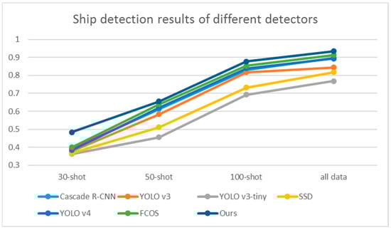 In order to demonstrate the superiority of our proposed method, we make a comparison with two state-of-the-art few-shot learning methods, including SAMBFS-FSDet [63] and G-FSDet [64]. As for the two methods, Faster R-CNN and TFA [65] are used for the few-shot object detection framework. In the fine-tuning stage, we use the previously labeled ship samples as the novel classes to achieve a few-shot ship detection target. The comparison results are presented in Table 6. From the table, it can be observed that our proposed method is still competitive compared to the state-of-the-art few-shot learning methods.