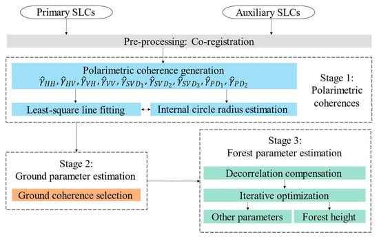 The proposed workflow contains three main stages as summarized in Figure 3. The grey rectangle is the pre-processing before polarimetric coherence generation. The blue parts of Stage 1 are core procedures related to the polarimetric coherences, the orange part of Stage 2 is used for ground parameter estimation, and the green parts of Stage 3 are about the forest parameter estimation.