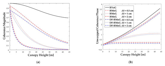 As shown in Figure 4a, the magnitudes of RVoG, RMoG, and DF-RMoG coherences start from different initial values (DF-RMoG < RMoG < RVoG = 1), and gradually decrease with the increase in canopy height. The ground motion decorrelation component causes the smaller initial value of the RMoG magnitude. Similarly, for the DF-RMoG model, besides the motion factor, the dielectric fluctuation aggravates the temporal decorrelation and thus causes an even smaller initial magnitude. Moreover, in comparison with the RVoG coherence, the RMoG, and the DF-RMoG magnitudes decrease more rapidly to zero when increasing the value of the motion variance gradient.