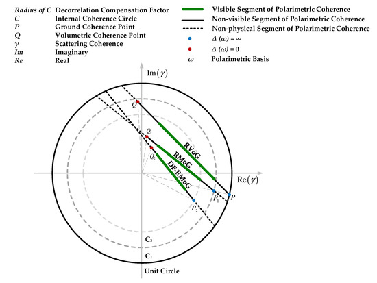 In comparison with the RVoG model, although the random motion property of the RMoG model changes the locations of the polarimetric coherences in the complex plane, the integral locus remains linear and varies with the ground-to-volume ratio, as demonstrated in Figure 5. Similarly, when the ground-to-volume ratios are zero and infinite, the coherences become point Q1 () and point P1 (), respectively. P1Q1 is the physical segment of the RMoG locus with the visible part marked as green. Instead of the unit circle, P1 is the intersection point between the coherence line and the internal circle C1 whose phase is identical to point P because the ground motion decorrelation is a real number less than 1. In addition, the radius of point Q1 is much shorter than that of point Q due to the motion decorrelation from the volume layer.