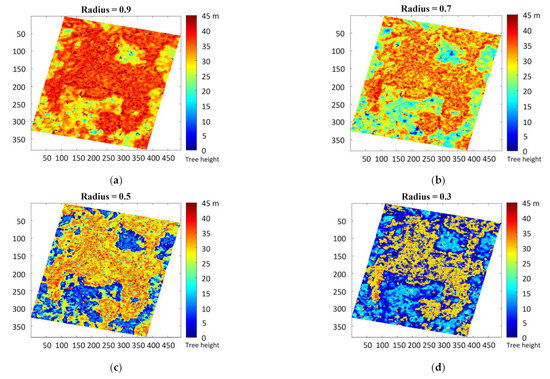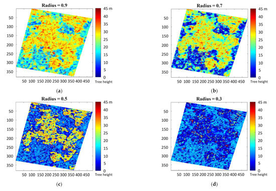 The forest height estimation of Pol-InSAR data with a temporal baseline of 46 days are shown in Figure 6. They are the results with different sampled compensation factor values, including 0.9, 0.7, 0.5, and 0.3, as shown in Figure 6a–d, respectively.