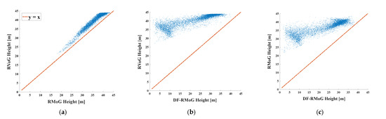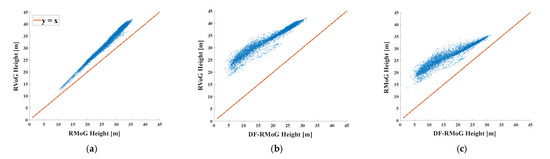 The same conclusion can be summarized in Figure 9c that the proposed DF-RMoG method can largely decrease the overestimation errors compared with RMoG. This is because the scatter plot locates overall above the identity line in Figure 9c. This agrees well with the results in Figure 9a,b. Meanwhile, for the same reason, the differences between the RMoG and DF-RMoG heights decrease with the ascending forest height.