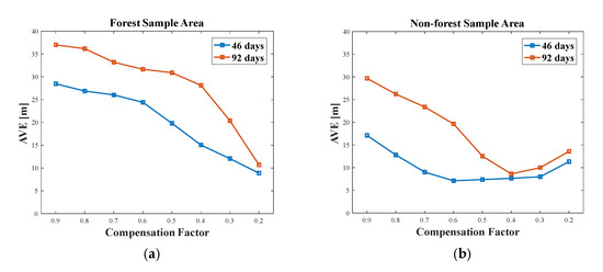 AVE variation versus different compensation factors: (a) forest sample area. (b) non-forest sample area.