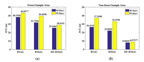 For the temporal baseline of 92 days, in both forest and non-forest samples, the AVEs still follow a decreasing trend at 46 days. Likewise, the RDPs of the RVoG and RMoG heights versus DF-RMoG heights are calculated as 32.8% and 26.8% in the forest samples and 75.9% and 72.9% in the non-forest samples. These results agree with the above-mentioned conclusion that the DF-RMoG method suppresses the overestimation errors more effectively than the RVoG and the RMoG methods, especially in non-forest areas.