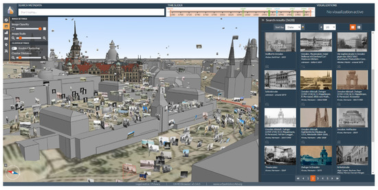 The 4D browser was initially conceptualized and developed in the project UrbanHistory4D as a tool to support scholars in their art and architectural history research [1]. Images and photographs in particular are essential sources and key objects in this field of research. Unlike conventional media repositories where images can only be searched by metadata, the 4D browsers follow a spatial approach. The graphical user interface integrates a 3D viewport where the user is able to browse for spatialized images within a 3D city model without the necessity of having detailed knowledge about the object of interest and any metadata of corresponding images (Figure 1). Of course, a metadata search is still possible, but the user does not need to rely on it exclusively. With the time slider, temporal constraints can be set separately for the buildings, the images, and the maps. The filtering of images can also be achieved by interacting with the buildings or the 3D objects. The spatial approach also opens up new possibilities for gaining new knowledge, including taking the perspective of the photograph and understanding the photographer’s situation [24], as well as using special visualizations to answer specific research questions [25].