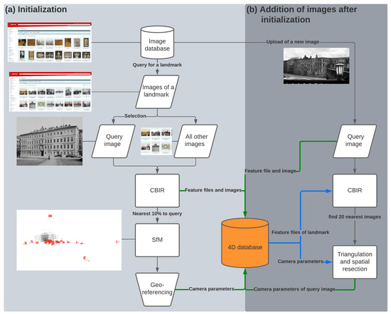 Another issue is that data are often processed and used for visualization purposes, but are mostly not accessible after a project is completed. We tackle that problem by efficiently storing camera parameters as metadata for every historical image following the close-range photogrammetry Guide to Good Practice of the Archaeology Data Service (https://archaeologydataservice.ac.uk/help-guidance/guides-to-good-practice/data-collection-and-fieldwork/close-range-photogrammetry/introduction/close-range-digital-photogrammetry-in-archaeology/, accessed on 15 March 2023). Therefore, the presented approach shows a bipartite pipeline that includes the initialization of a new dataset and the subsequent addition of new images as shown in Figure 2.