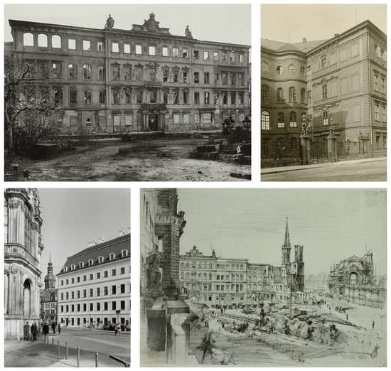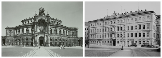 The research focuses on the Semperoper, which is a very famous building in Dresden and has 2172 hits when searching by metadata in the Deutsche Fotothek (https://www.deutschefotothek.de/, accessed on 30 November 2022). A query image for filtering exterior views is required for CBIR, so the focus is on the main façade (view from the south-east, Figure 3). To demonstrate that the approach is also applicable to smaller landmarks or even side streets, Taschenbergpalais is selected as a second building. It contains 584 hits in the Deutsche Fotothek (https://www.deutschefotothek.de/, accessed on 30 November 2022), with many views from far away. The query image shows the only unobstructed view from the north with only a few relevant hits in the Deutsche Fotothek (Figure 3).